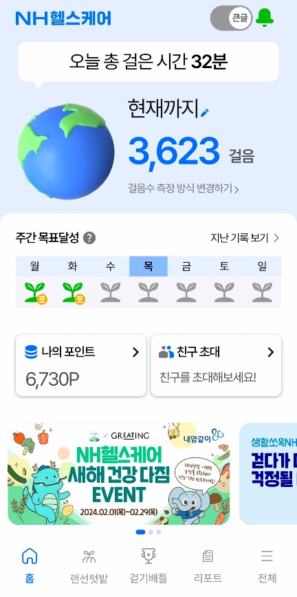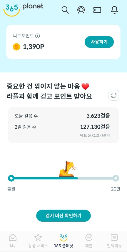 교보생명에서 만든 앱이고, 걷기 미션을 통해 씨드포인트를 받을 수 있는데, 최초 1만걸음때 1,000P이고 1만걸음씩 추가될 때마다 100P를 받을 수 있고, 그 달에 20만 걸음을 달성했을때 1,000P를 받을 수 있습니다. 걸음수가 매일 산정되는 방식이 아니라, 한달 내에서 적립되는 방식이므로 여유가 있습니다.