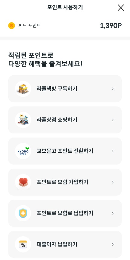 적립된 씨드포인트는 라플책방 구독, 라플상점 쇼핑, 교보문고 포인트로 전환, 포인트로 교보생명보험가입·보험료·대출이자 납입 등이 가능합니다.